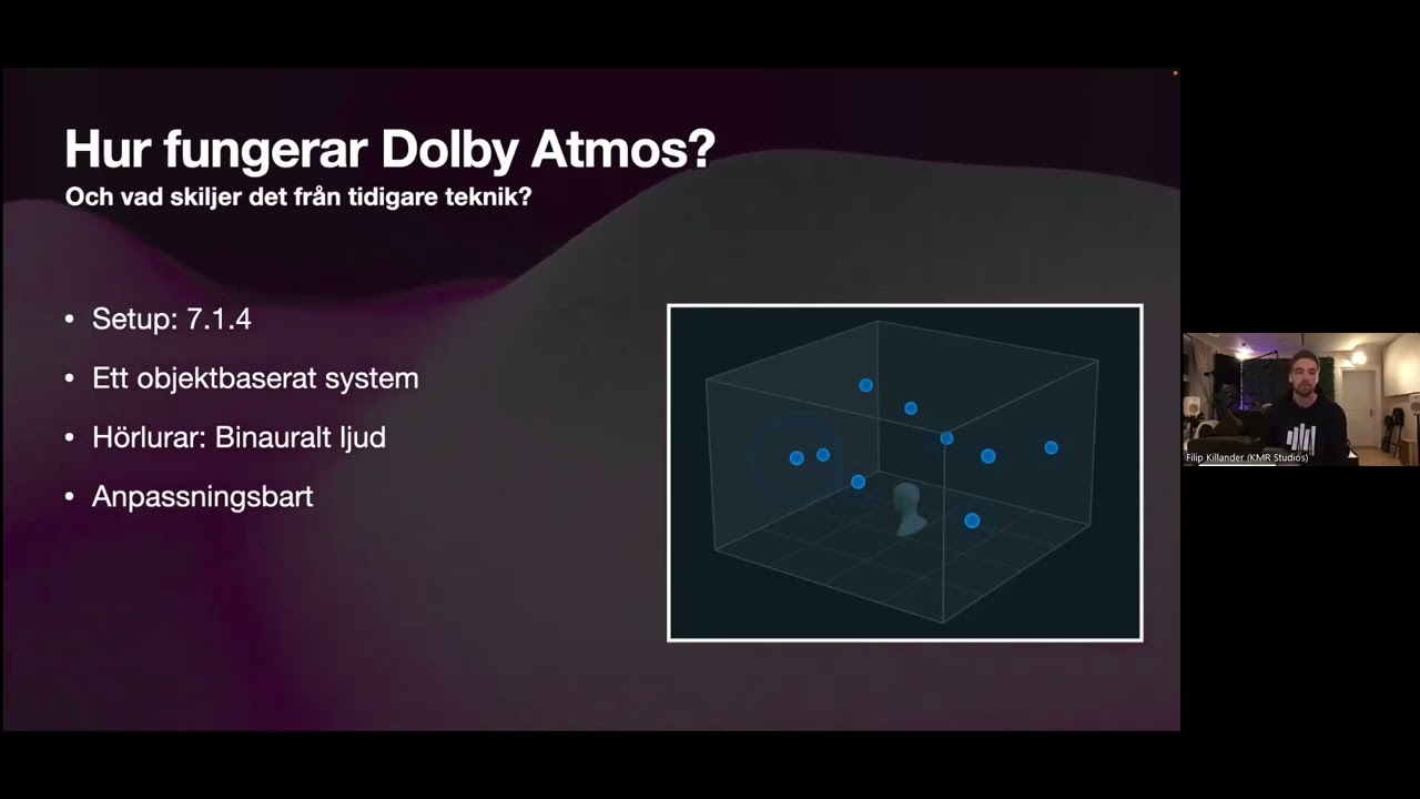 Föreläsare denna kväll var Filip Killander som kunde berätta om hur ljudet, tack vare de många högtalarna, kan placeras runt lyssnaren och hur upplevelsen blir något annat än en vanlig stereolyssning. Kopplingen till film är lätt att förstå, men grundidén är att även musik utan bild ska kunna upplevas i ATMOS-miljön.