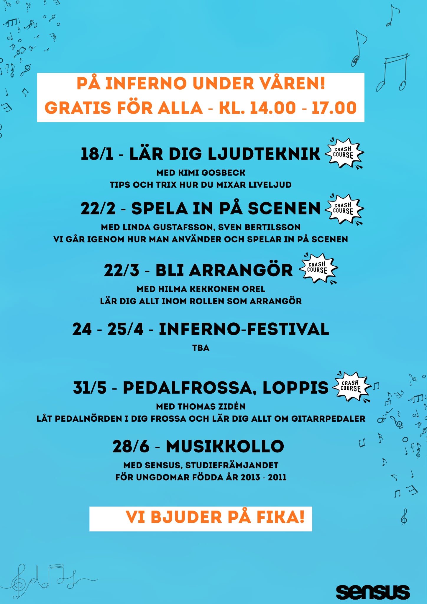 Under våren gästar Sensus musikhuset Inferno i Katrineholm och gör några söndagar lite extra fina genom fyra crashkurser i ljudteknik och arrangörsskap. En upptakt till Infernos 30-årsfirande i april!
